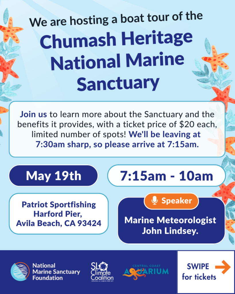 Join us on a boat tour of the Chumash Heritage National Marine Sanctuary (CHNMS) and learn about how the sanctuary benefits the Central Coast! Hear from our speaker, John Lindsey, marine meteorologist.